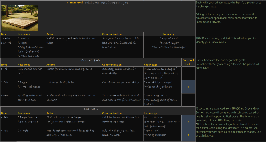 This spreadsheet, which I personally rely on for tracking all my goals, big or small, is a testament to how organizing your objectives can empower you. I encourage you to create your own format that resonates with your aspirations and even discover ways to automate it for efficiency. Your journey is unique, and how you “TRACK” it should be too. Embrace this opportunity to shape your future, one goal at a time.